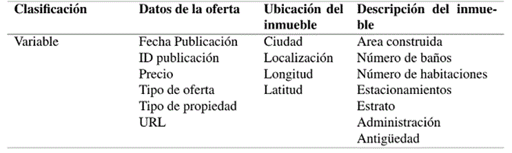 Para el desarrollo de esta investigación se tomó como fuente de datos la plataforma web Fincaraiz, de la cual se seleccionaron las variables que se disponen en la tabla II. Se consideran de este sitio las variables de latitud y longitud para tener la posibilidad de definir patrones espaciales y de forma particular; se aclara que la variable precio, reportada en la plataforma, corresponde al valor de la oferta más no al valor pactado dentro de la negociación del inmueble, situación que se encontraría para cualquier plataforma web inmobiliaria. Por otro lado, para identificar los factores asociados con el entorno, que pueden influir en el valor de los predios, se tuvieron en cuenta las plataformas de Open Street Maps y Google Places, de donde se extrajeron los sitios de interés.