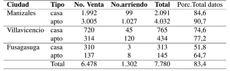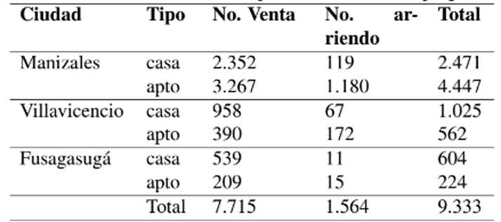 El proceso de Web Scraping se realizó el 29 de septiembre del 2020 para las zonas urbanas de los municipios de Manizales, Fusagasugá y Villavicencio. Para cada una de estas zonas se consultaron las casas y los apartamentos en arriendo y venta. Los resultados obtenidos se resumen en la tabla III.