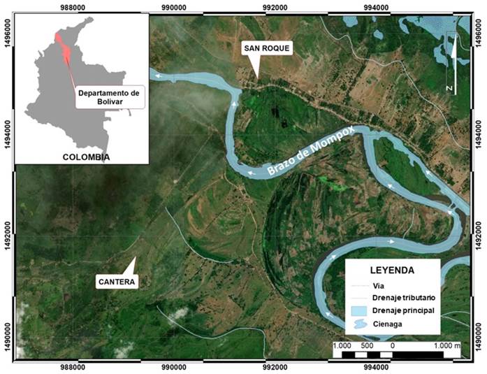 El área de estudio se enmarca en la margen izquierda del brazo de Mompox del río Magdalena en dirección Este, a la altura del corregimiento de Cantera, departamento de Bolívar (Colombia).