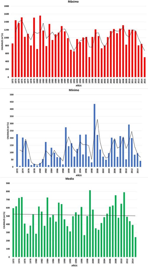 En general los caudales muestran valores simétricos, es decir, picos y depreciones con frecuencias temporales similares. Los máximos caudales presentaron picos altos en los años 1981 (1.559 m3/s), 1988 (1.293 m3/s), 1999 (1.208 m3/s), 2005 (1.219 m3/s), 2008 (1.315 m3/s) y 2010-2011 (1.200 m3/s). Por otra parte, los caudales mínimos muestran depresiones en los años 1977 (12 m3/s), 1983 (11,89 m3/s), 1988 (17 m3/s), 1992 (71,30 m3/s), 1998 (30,75 m3/s), 2003 (48,75 m3/s), 2007 (69,50 m3/s), 2010 (51,75 m3/s) y 2015 (41,25 m3/s). Mientras los valores medios anuales de los caudales exhiben un promedio de 500 m3/s aproximadamente.