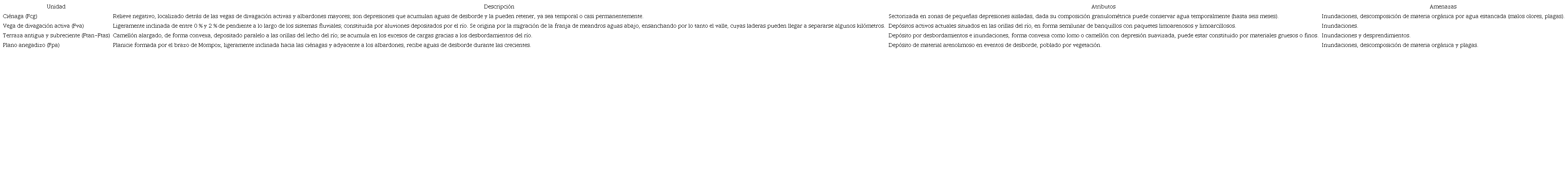 Las unidades geomorfológicas presentes en el área pertenecen al ambiente de formación fluvial-lacustre, como ciénaga, vega de divagación activa, plano anegadizo, terraza antigua y subreciente, geoformas que favorecen procesos de inundación, debido a los atributos o las características que presenta cada uno.