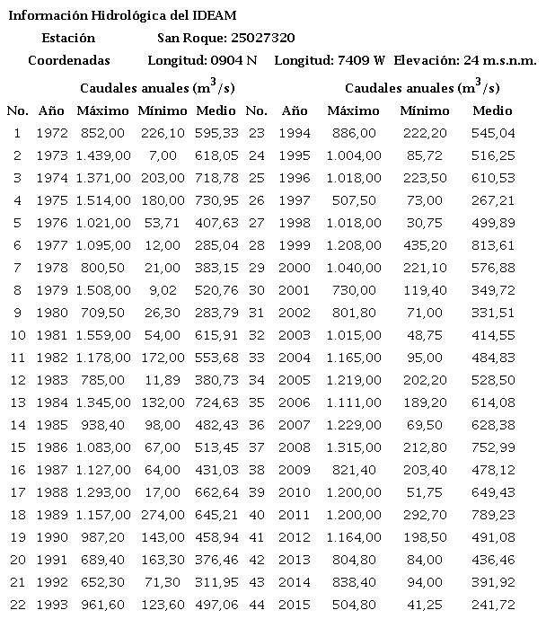 Se recopiló información del brazo de Mompox desde el 1972 hasta el 2015 (Tabla II), utilizada para un análisis estadístico de los periodos de retornos de futuras inundaciones que se puedan presentar.