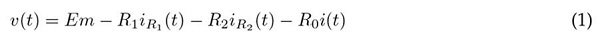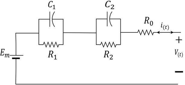 El modelo de polarización dual puede considerarse una extensión del modelo Thévenin. Este modelo, ilustrado en la Fig. 3, considera un bloque R-C adicional en serie al circuito presentado en la Fig. 1d con el objetivo de mejorar la precisión en la respuesta del modelo, donde Em representa el voltaje de circuito abierto, la resistencia R1 la polarización electroquímica, R2 la polarización de concentración y R0 la resistencia óhmica. Los capacitores C1 y C2 representan la respuesta transitoria de la transferencia de potencia desde y hacia la batería e i(t) es la corriente de carga y descarga de la batería. El voltaje en los terminales de este circuito esta descrito por la Ec. (1) .