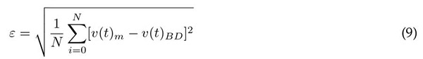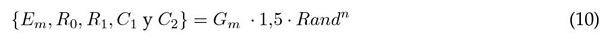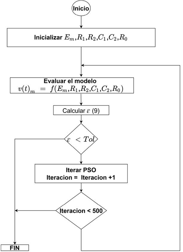 Para lograr esto se ejecutan los siguientes pasos: i) se inicializan los argumentos del modelo dentro del espacio de búsqueda, ii) se evalúa el modelo con estos parámetros y se obtiene la respuesta v(t)m, iii) se evalúa la Ec. (9) , iv) si el error ε es menor al valor esperado se finaliza el algoritmo, de lo contrario se procede al siguiente paso, v) se itera una vez el algoritmo PSO, si el número de iteraciones es menor al valor máximo seleccionado se finaliza el algoritmo, de lo contrario se repite el algoritmo desde el paso ii) hasta que alguna de las condiciones de finalización se cumpla.