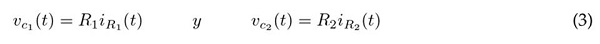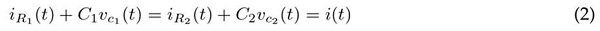 Las corrientes en R1 y R2 más la corriente de su respectivo capacitor en paralelo son iguales a i(t). Adicionalmente, sabiendo que ic = Cvc(t) se obtiene la Ec. (2)