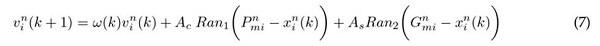 (k + 1) y x n i (k) representan la posición actual y previa y v n i (k + 1) y v n i (k) denotan la velocidad actual y previa respectivamente. ω(k) es el peso de inercia, Ac y AS son la tasa de aprendizaje cognitivo y social, finalmente Ran1 y Ran2 son números aleatorios con distribución uniforme que comprende los valores entre 0 y 1. Una versión local del PSO modifica el seguimiento global de las partículas por una topología de vecindad, donde cada partícula se direcciona hacia la mejor solución de la vecindad 28.