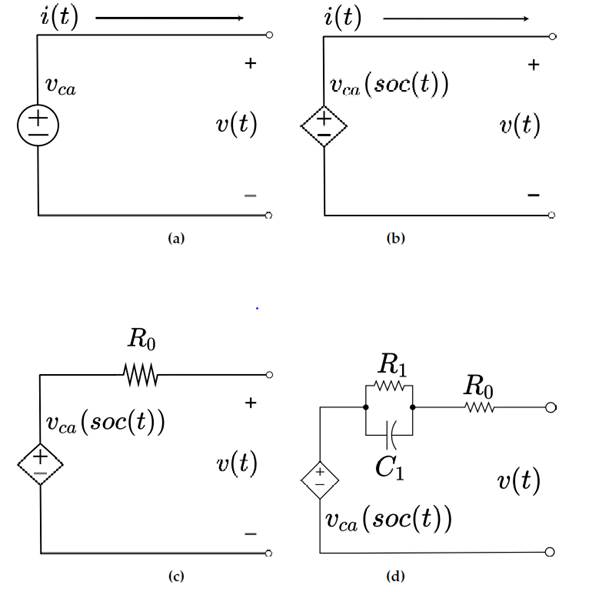 Dentro de los ESS, las baterías son los elementos más utilizados siendo la combinación ion litio la más prometedora actualmente, debido a su alta densidad de potencia y de energía. Para poder analizar el comportamiento de las baterías en las diferentes aplicaciones, típicamente se utiliza una metodología basada en simulación, donde se analizan las características principales como voltaje con base en el comportamiento electroquímico 3, corriente de la batería, estado de carga (SoC por su sigla en inglés) 4 y estado de salud (SoH por su sigla en inglés) 5. Obtener un modelo que describa el comportamiento físico que gobierna la operación de las baterías permite generar, bajo simulación, un análisis más preciso de cómo responden las baterías a diferentes escenarios de uso y una confiabilidad alta al momento de validar los conceptos bajo pruebas experimentales. Los modelos de baterías encontrados en la literatura se pueden clasificar en modelos empíricos, modelos abstractos, modelos electroquímicos y combinaciones 6), (7) y (8. Una fuente de voltaje con energía infinita de carga/descarga es la manera más fácil de modelar una batería 9, sin embargo, no es una aproximación muy exacta al comportamiento de una batería ya que no se incluyen las dinámicas de carga y descarga (Fig. 1a). La dependencia del voltaje de circuito abierto en función del SoC se presenta en 10, donde el voltaje de una celda completamente cargada es mayor al de una celda descargada (Fig. 1b). La polarización se refiere a cualquier desviación del voltaje en los terminales de la celda debido al paso de corriente. Para incluir el efecto de polarización en la celda se incluye a esta fuente de voltaje una resistencia en serie 2, la cual describe que el voltaje en los terminales de la celda cae por debajo del voltaje de circuito abierto cuando la celda es descargada y aumenta por encima del voltaje de circuito abierto cuando la celda está siendo cargada (Fig. 1c). La variación de voltaje debida a la polarización es un proceso que se genera lentamente con el tiempo a medida que la corriente sale o ingresa a la celda e igualmente decae lentamente con el tiempo cuando la celda se encuentra en reposo después de interrumpir la corriente de carga o descarga. Este efecto es conocido como difusión, el cual es aproximado incluyendo uno o más paralelos de resistor - capacitor a los circuitos anteriores como se puede ver en la Fig. 1d, entre más paralelos se agreguen al circuito se mejorará la precisión en el comportamiento esperado, sin embargo, la complejidad es aumentada considerablemente; lo más recomendado es utilizar uno o dos paralelos 11), (12. Otro tipo de efectos como la respuesta en frecuencia (modelo Randles) y la histéresis son modelados y presentados en 13 y 14. Cada uno de estos parámetros adicionados al modelo dependen de la tecnología, referencia de batería y SoH, debido a esto es posible obtener un modelo aproximado para las condiciones de operación de una batería específica, para lo cual hay que encontrar el valor de estos parámetros. La estimación de los parámetros del modelo en función del SoC se puede realizar usando diferentes métodos basados en modelos, los cuales en tiempo real cuentan con una gran robustez y precisión, debido a que tienen una gran adaptabilidad y buen rendimiento, pero se requiere de un modelo muy fiel de la batería y un alto costo en el cálculo de los datos 15.