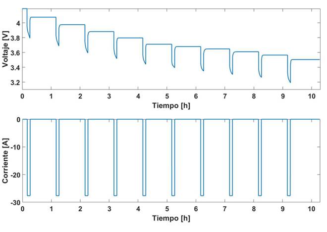 Para este trabajo se utiliza la base de datos Randomized Battery Usage Data Set de la NASA 26, la cual contiene una recopilación de pruebas eléctricas aplicadas sobre baterías de ion litio, que constan de perfiles de carga aleatorios y perfiles de carga con referencia, brindadas de forma gratuita para generar investigación en torno al modelado de baterías. La Fig. 2 muestra una de las curvas encontradas en la base de datos, que consiste en descargar a la batería con pulsos de corriente de 0,1 C por 0,1 horas (6 minutos), seguidos por periodos de relajación de 0,9 horas (54 minutos) con corriente cero.