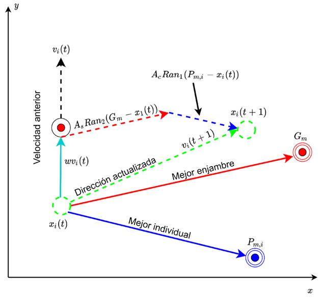 Las composiciones que dominan el movimiento de cada partícula se muestran en la Fig. 4, donde el vector de color verde representa la ubicación de exploración de la partícula, que se calcula a partir de su experiencia particular (mejor posición que ha evaluado la partícula) y de la experiencia global (mejor posición que ha evaluado todo el enjambre). Para lograr este cálculo, cada partícula comparte información con el resto del enjambre de cierta manera durante su exploración y explotación. Entonces cada partícula actualiza su dirección de vuelo basada en su propia mejor experiencia exploratoria local (Pm) y la mejor experiencia global (Gm) de acuerdo con las Ec. (7) y (8) :