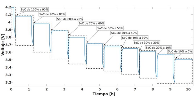 Estas pruebas permiten evaluar los cambios transitorios del voltaje en los terminales de la batería en función de la corriente, el proceso de difusión del circuito equivalente y observar su funcionamiento a diferentes valores de SoC. La secuencia de pulsos se realiza en un solo punto de funcionamiento con respecto a temperatura, corriente y condiciones SoH.