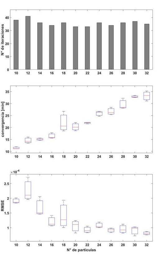 Posteriormente, el modelo es parametrizado utilizando el método propuesto, para el cual se usaron diferentes partículas, desde 10 hasta 32, con incrementos de dos, con cinco ejecuciones para cada número de partículas seleccionado. La Fig. 7 presenta los resultados obtenidos, la primera gráfica muestra el promedio de iteraciones para cada selección de partículas y en las dos gráficas inferiores se ve el tiempo de convergencia en minutos y el error cuadrático medio mínimo logrado respectivamente.