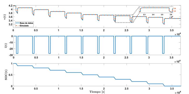 Adicionalmente, se puede observar que debido a que el algoritmo PSO es una técnica metaheurística, el comportamiento del tiempo de convergencia y el error no son iguales para cada ejecución del código, lo que conlleva a obtener que para algunas cantidades de partículas las desviaciones estándares sean más altas que otras. Buscando obtener un excelente compromiso entre el tiempo de convergencia y precisión se seleccionaron 15 partículas y se ejecutó nuevamente el algoritmo, a partir del cual se encontraron los 66 valores que permiten que el modelo de la batería tenga una dinámica muy cercana a la dinámica obtenida en la curva experimental, la cual se puede ver en la Fig. 8 donde se obtiene un RMSE del 0,0001.