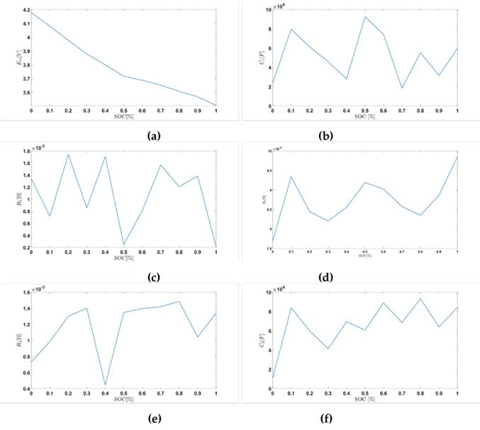 En la Fig. 9 se puede observar la variación de los seis parámetros del modelo {Em, R0, R1, C1, R2 y C2} respectivamente en función del estado de carga (SoC), los cuales son los elementos que conforman el modelo circuital de la batería de ion de litio.