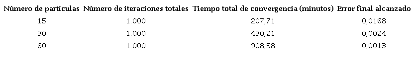 Inicialmente se utiliza el PSO con el método típico encontrado en la literatura, el cual es un problema de 66 dimensiones (seis parámetros para cada SoC). El algoritmo es ejecutado utilizando 15, 30 y 60 partículas, se repite cinco veces para cada selección de partículas. Los mejores resultados para cada selección se presentan en la Tabla III. Se puede notar que para las tres soluciones se alcanza el número de iteraciones máximas, además al aumentar el número de partículas se reduce el error obtenido, pero igualmente se aumenta el tiempo de ejecución debido a que más partículas conlleva a un número mayor de ejecuciones del modelo.