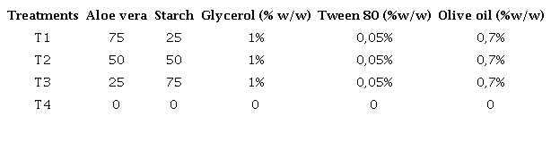 The edible coatings for three treatments (T1, T2, and T3) were prepared following the formulations in Table I. The starch was heated and agitated in a water bath until it gelatinized at a temperature of 67 °C at 1.200 rpm. After that, aloe vera was added to the starch under agitation at 85 °C until a homogenized solution was obtained. The samples were covered by immersion for 1 min in the prepared solutions. The coated samples were air-dried at room temperature and packed in polystyrene trays. Finally, the samples were sealed with a commercial film (polyvinyl chloride) and stored at 4 °C for 16 days.