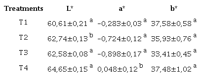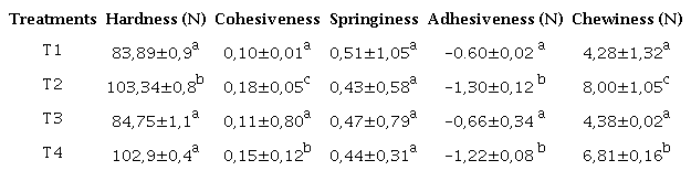 The texture profile analysis is depicted in Table II. The T2 treatment obtained values close to the control (T4). Likewise, the statistical analysis of this treatment (T2) showed no significant differences in parameters such as adhesion and elasticity when compared to the control. T2 reported a higher hardness (103,35 N) during the storage time, which indicates that a greater force is required to compress it. This value is closely related to cohesiveness, as the particles in the food require greater force to be compressed (i.e., the cohesion showed a behavior that is proportional to hardness).