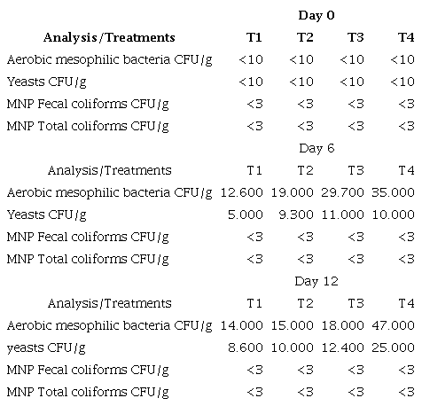Microbiological parameters were analyzed by counting according to the corresponding Colombian Technical Standards (NTC): aerobic mesophilic bacteria (NTC 4519) 19, total coliforms and fecal coliforms (NTC 4516) 20, and yeasts (NTC 4132) 21.