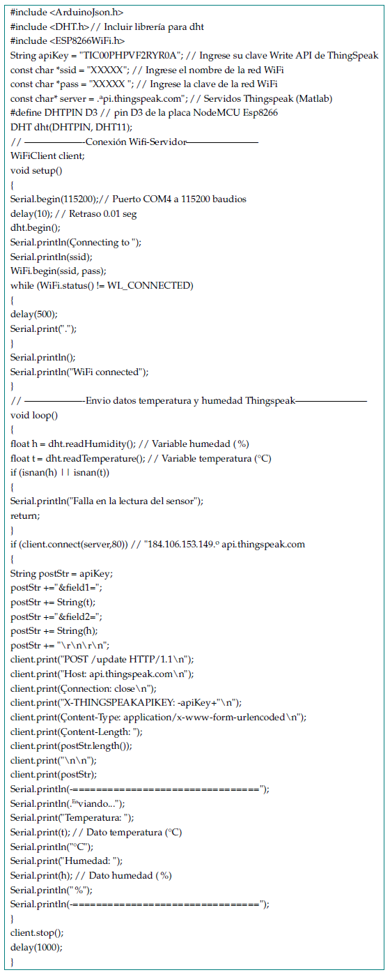 The hardware consists of the ESP8266 NodeMCU board, and a DHT11 temperature and relative humidity sensor. The DHT11 sensor was selected because it is laboratory-certified. It is an accurate and stable device, generates a digital signal output, and has an NTC (negative temperature coefficient) thermistor 9. This sensor consists of a thermistor for in-situ air temperature measurement. It has three terminals: +Vcc (voltage), Gnd (ground), and DATA (signal). The signal is transmitted through pin D3 of the ESP8266 NodeMCU module. The temperature values (°C) were calibrated from the measurements made by a digital thermo-hygrometer (TTH002), with a temperature measurement range between -50 and 70 °C, a resolution of 0.1, and an accuracy of ±1 °C. Similarly, the device capture range for the relative humidity ( %) is between 15 and 95 %, with a resolution of 1 % and an accuracy of ±5 %.