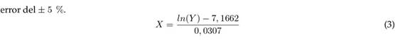 Se usa la ecuación de la recta descrita en la Fig. 5 para corregir los datos mostrados por el sensor, los cuales están dentro de su rango limitado de medición, corrigiendo el valor al rango extendido descrito en la gráfica. Se despeja la concentración corregida ( %v/v) y se calcula con la relación de la concentración en ppm leída por el sensor, implementando pendiente y corte con la ordenada descrita por la línea de tendencia. En la Ec. 3 se define X como la concentración de metano esperada y Y como las ppm registradas por el sensor. Cabe agregar que se determinó un error del ± 5 %
