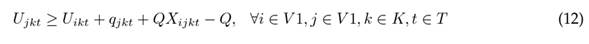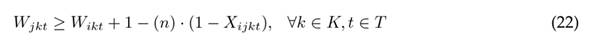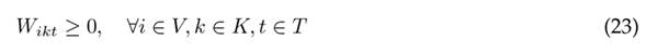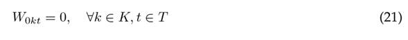 Las variables de decisión Wikt indican el orden en que se visitan los clientes en la ruta de cada período, definiendo, para cada vértice j en el período t, el número total de clientes ya visitados por la ruta desde el período t después de visitar a un cliente. En este sentido, se deben reemplazar las restricciones (12) y (13) y añadir (21), (22) y (23). Las restricciones (21) garantizan, para cada instante t, que el flujo inicie en el vértice del proveedor. El conjunto de restricciones (22) se refiere al aumento de una unidad de flujo cada vez que se pasa por el vértice del cliente a visitar, es decir, si el vértice j ocurre inmediatamente después del vértice i, se incrementa una unidad en la variable Wikt para contar los clientes visitados en esa ruta, evitando la aparición de sub-tours, además de cancelar a los clientes que no pertenecen a la ruta. Finalmente, la naturaleza de la variable se define en la Ec. (23).