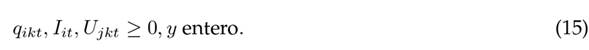 A su vez, las Ecs. (5) y (6) identifican la política de manejo de inventarios ML, donde se optimiza la cantidad de producto entregado en cada visita a los clientes, asegurando que se respete la capacidad de cada almacén. La Ec. (7) establece que la cantidad de producto a enviar a los clientes introducidos en la ruta debe ser menor o igual que la máxima capacidad de los vehículos. La Ec. (8) establece que, si al cliente i se le envía producto a través del vehículo k en el periodo t, entonces solo se puede activar uno de todos los posibles arcos de entrada. La Ec. (9) establece que, si al cliente j se le envía producto a través del vehículo k en el periodo t, solo se puede activar uno de todos los posibles arcos de salida. La Ec. (10) indica que, si se ingresa al nodo j por medio de un arco, también se debe de salir del nodo j por un arco. Las Ecs. (8), (9), (10) aseguran la conservación del flujo de las rutas, con una única entrada y salida de los nodos para el vehículo k en el periodo t. La Ec. (11) establece que se debe iniciar siempre desde el nodo del centro de distribución. Las Ecs. (12) y (13) garantizan la conexión de los circuitos sin la creación de sub-tours en la formulación general por el método MTZ, la cual fue propuesta por 23 y adaptada al modelo. Finalmente, las Ecs. (14) y (15) presentan la naturaleza de las variables.