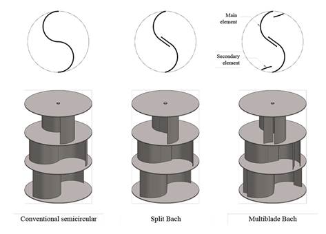 In previous studies, it was evidenced that employing multiblade profiles in the blades of this type of rotors can improve their performance by 10,8 % with respect to a profile without the secondary element (split Bach profile), as well as by 51,2 % regarding conventional semicircular profiles (Fig. 1) 6, 13) (17. Additionally, the implementation of a multiblade geometry allows greatly preserving the construction and operation simplicity that characterize Savonius-type rotors 13.