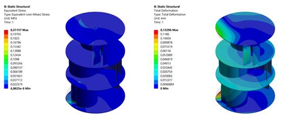 Figure 10. State of equivalent stress (left) and total deformation (right) of the multiblade Bach rotor for a wind of 4 m/s and a T SR of 0,5