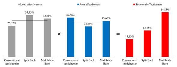 Both indicators were multiplied to obtain a structural effectiveness value which showed that the changes made to the geometries, starting from the conventional semicircular profile, had positive impacts on structural stability. An increasing trend in the evolution of the rotor can be seen by means of this indicator.