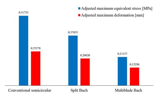 The adjusted maximum equivalent stresses were reduced by 59,10 and 42,87 %, and the deformations by 47,40 and 33,59 % with respect to the conventional semicircular and split Bach profiles, respectively.