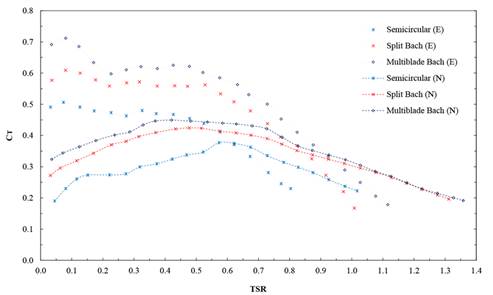 where the subscripts adj, i, and j refer to the adjusted value, rotor i, and rotor j (multiblade Bach rotor in this case), respectively. Thus, the values reported in Table V were adjusted under the same load conditions of the multiblade Bach profile and are presented in Fig. 12