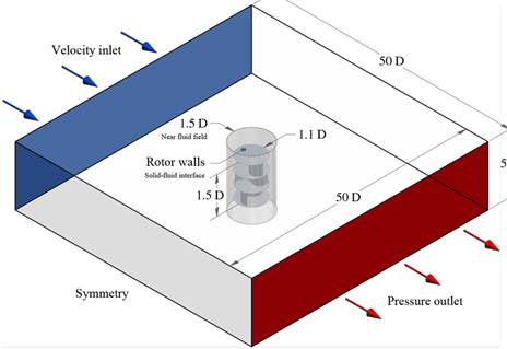 The domain of analysis comprises two bodies: a fluid body and a solid body. The fluid body is made up of two parts: an orthohedral region that simulates the far fluid field, and a cylindrical one for the near fluid field, which contains the geometry of the rotor.