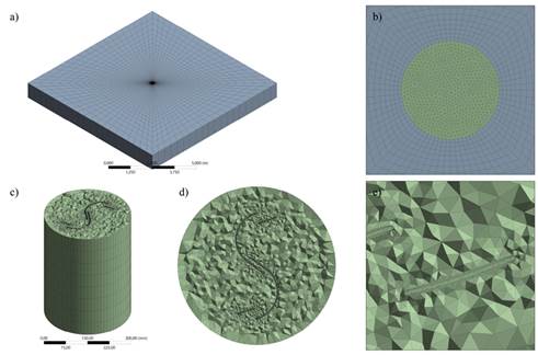 Since the model was made up of two bodies, an independence analysis was carried out for each of them. For the fluid body, five discretizations (known as meshing) were built with the same structure, but with an increased number of partitions in each edge according to the refinement of each mesh. The region that simulated the far field of the fluid had a structured mesh with only hexahedral elements (Figs. 6a and 6b), while the region that simulated the fluid field near the rotor had an unstructured mesh with only tetrahedral elements in order to gain greater adaptability to the geometry (Figs. 6c and 6d). The meshing adjacent to the rotor walls was refined and had a structure of perpendicular layer (inflation) that allowed for a better prediction of the boundary layer (Fig. 6e).