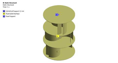 The supports and the loads of the model were considered as shown in Fig. 8. A fixed support was located in the lower hub of the rotor, simulating a full load exerted by the generator. Similarly, a cylindrical support was placed on the upper hub, simulating the restriction in the bearing. Additionally, the aerodynamic loads imported from the fluid dynamic analysis were applied to the rotor surface.