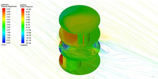 After solving the fluid physics, each rotor’s states of pressure and flow velocity were obtained. Fig. 9 shows the state of static pressure exerted by the fluid on the walls of the multiblade Bach rotor model by means of a contour graph. In the same figure, the fluid path lines and the corresponding velocity magnitude are shown for a flow plane. Areas of laminar flow, stagnation, recirculation, and fluid acceleration can be identified.