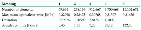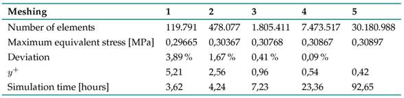 When solving each case with the different meshings, the maximum equivalent stress value was obtained, whose variation was observed to become smaller as the meshing became finer (Tables II and III). For fluid and solid body analysis, the asymptotic convergence indicators, according to the Richardson extrapolation, were 1,0042 and 1,0289, respectively, whose closeness to the unit indicates the existence of a convergence value 51.