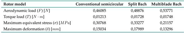 Results: The results obtained showed a better structural behavior in the rotor with the multiblade configuration, reducing the maximum equivalent stress by 59,10 and 42,87 % and the deformations by 47,40 and 33,59 % with respect to the rotors with the conventional semicircular and split Bach profiles, respectively.