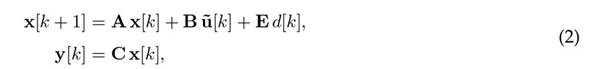 where x[k] ∈ Rn, ∈ Rm, and y[k] ∈ Rp are the discrete-time system state, input, and output, respectively. The signal d[k] ∈ R corresponds to disturbances such as noise, nonlinearities, model inaccuracies, or uncertainties; and the matrix E ∈ Rn×1 represents how the disturbances affect the system. Note that the system input is not u[k] but
