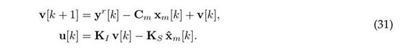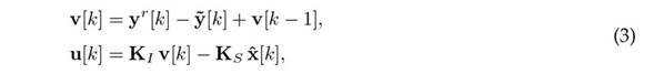 is the estimated state. Note that the first equation in (3) expresses the integrator state (which, in this case, is considered as an interior variable of the controller in Fig. 1), where v[k] ∈ Rp is a discrete-time approximation of the error integral, with the error defined as e[k] = yr [k] − y[k]. The control signal u[k] is obtained as a linear combination of the states, through the state feedback gain KS ∈ Rm×n, and a linear combination of the error integral, through the integral gain KI ∈ Rm×p