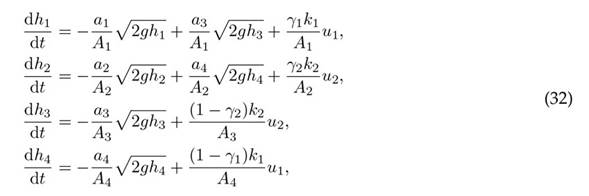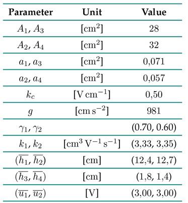 where Ai is the area of the i-th tank, ai is the outflow section of the i-th tank (at the bottom of the tank), g is the acceleration of gravity, γj ∈ [0, 1] for j = 1, 2 is a proportional constant that divides a pump flow uj in two parts (γj and its complement to feed two different tanks), and kj are the pump gains. The parameters of the system are the same as in 19, as shown in Table I