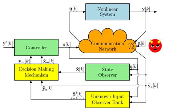 In the context of multi-sensor schemes, where redundant information helps to improve the security and accuracy of state estimation, some works can be mentioned: 15-17. A particular approach to achieving a fast-secure estimation is presented in 15, where the authors leverage the advantage of sensor redundancy in some systems. Therein, a quantification of the measurements’ degree of similarity is defined, which allows for a convenient categorization of the sensors and increases the computational efficiency of the state estimation. For nonlinear systems, in 16, methods of nonlinear fusion estimation in a distributed framework are utilized in order to obtain a secure estimation, in cases where sensor measurements are corrupted with false data injection attacks. In this approach, no prior information about the attack is necessary. In 17, the encryption of the information transmitted and received through a wireless channel of a control system is shown to be effective against linear deception attacks. This work provides valid results even if the attacker has information about the watermark used to encrypt the innovation sequence.