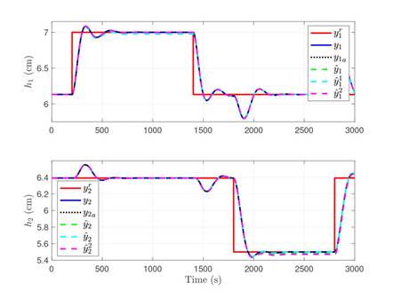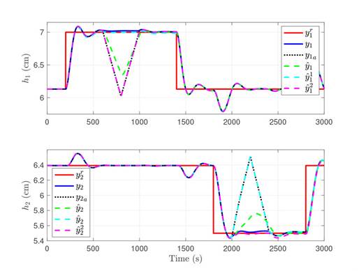 Fig. 2 also shows the output variables estimated by the full order current observer, , where the estimates of the outputs are similar to their ideal values. However, since the variables and their estimate have differences, such offset can be used to determine the detection threshold. The full order current estimator-associated threshold was selected after performing multiple simulations, considering the system behavior in light of various inputs. This, in order to select a value that does not generate false alarms when there is no attack. In that sense, for the four tanks system, τD = 0, 033. full order current estimator-associated threshold was selected after performing multiple simulations, considering the system behavior in light of various inputs. This, in order to select a value that does not generate false alarms when there is no attack. In that sense, for the four tanks system, τD = 0, 033.