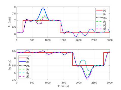 This section considers the four tanks benchmark initially proposed in 19. A tracking controller with state feedback is used, working with a full order current observer. The objective of this section is to show (i) the system working in closed-loop before any attack is considered, (ii) the effect of an attack on one output, and (iii) the effect on the system of using the proposed mitigation mechanism.