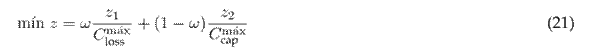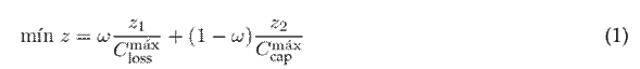 The objective function (OF) z used for the optimal integration of capacitor banks in EDNs minimizes two parameters: the annual costs of energy losses (z1) and the costs associated with capacitor bank installation (z2). These two objectives indicate that the proposed model is a multi-objective problema solved by incorporating a weighting factor (ω). The use of this factor is referred to as the weighted sum method24, which turns the multi-objective problem into a single-objective one by assigning weights to each objective. Furthermore, the OF is normalized to adequately balance both objectives. Thus, the proposed OF takes the following form: