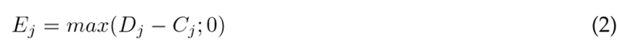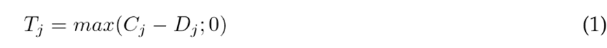 If job j is finished before the due date, the tardiness is 0, since none was generated. Tardiness does no´t take negative values; if that were to happen, we would be dealing with earliness. On the other hand, the eardiness Ej is calculated as the maximum value of the subtraction between the due date Dj minus the completion time of the job Cj 8. This is calculated via Eq. 2: