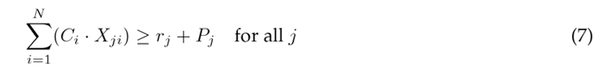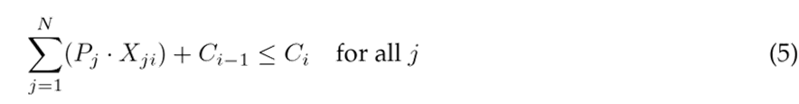 Following the model evaluation, it became apparent that Eq. 12 significantly contributes to the model’s complexity, thereby increasing computation times. To address this issue, linearizing the calculation is proposed, introducing the variable Si, which determinesthestarttimeofthejobatposition i. This variable is then incorporated into Eq. 13 to calculate the variable Ci. This modification results in an approximately 20% reduction in computation times. While this adjustment improves computational efficiency, its impact is not highly significant, and the formulation remains efficient for up to 20 jobs because, when the number of jobs grows, the number of equations also grows.