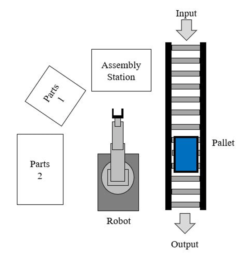 The SRAC is composed of one robot, which takes the components to be assembled from two deposits called Parts 1 and Parts 2. The combination of different parts allows assembling up to 12 different products without the need for reconfiguring of the robot. The task of joining different parts is carried out in the assembly station, and then, when the process complete, the product is positioned on the pallet to be transported to the next stages of the process. SRAC is the first stage of a three-stage process to complete a finished product. Fig. 2 shows a description of the SRAC.