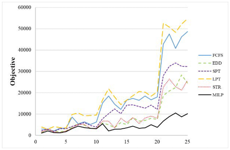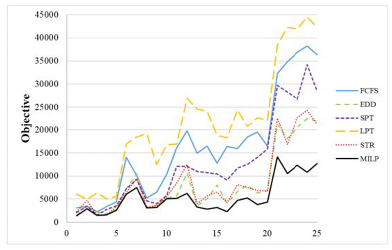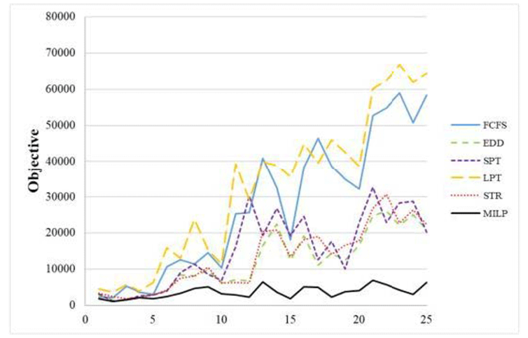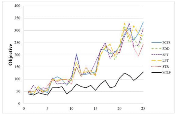 No significant differences can be observed between the dispatch rules used, and the gap with respect to the responses obtained by the MILP model increases as more jobs are scheduled. The evaluation results are presented in Fig. 7. It can be seen that, as the number of jobs increases, the performance of the dispatch rules becomes less competitive compared to the optimal solution obtained by the MILP model. This increasing gap highlights the computational superiority of the MILP model in handling larger scheduling problems and achieving more optimal results.