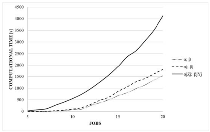 The MILP model demonstrated as significantly superior performance compared to the dispatch rules. However, it should be noted that the computation time of the modelincreases exponentially as the number of jobs increases. The model performs efficiently with a maximum of 20 jobs, but, beyond that, the computation time becomes impractical. Fig. 8 depicts the time curves obtained for the solution of the three types of analysis: constant α and β values, variable αj and βj values, and αjZj andβjYj multiplied by the binary variables. The instances were run on a laptop with an Intel(R) Core (TM) i3-6100U CPU @ 2.30GHz, processor and 6 GB RAM. As expected, the computation time increases as the complexity of the analysis increases, especially when considering variable penalty values and the multiplication of binary variables.