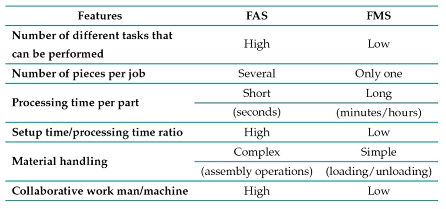 The current market demands increasingly personalized products at mass production prices. This poses a significant challenge for industries worldwide. To remain competitive in a globalized market, industries have implemented flexible manufacturing systems (FMS). FMS allows industries to meet market demands and reduce manufacturing costs, ultimately leading to profitability. FMS offer several advantages, particularly in terms of flexibility, which refers to a system’s ability to manufacture a wide range of products using the same equipment, with short setup times1.FMSaregenerallyclassifiedinto two main subgroups: flexible assembly systems (FAS) and flexible manufacturing systems (FMS) 2. Much of the research conducted in the field has predominantly focused on FMS, while FAS have received comparatively less attention. Both FAS and FMS are categorized as computer-integrated manufacturing systems, but they exhibit distinct differences in several aspects. Firstly, FAS are capable of processing a significantly greater number of diverse tasks compared to FMS. In FAS, multiple components and parts are joined simultaneously, whereas FMS typically operate on one part at a time. Secondly, the processing times required for each operation in FAS are shorter than in FMS. Consequently, the relationship between transfer and processing times in FAS are generally higher in comparison with that of FMS. Thirdly, the material handling systems of FAS tend to be more complex. These differences highlight the uniquecharacteristics and operational variance observed between FAS and FMS, suggesting the need for dedicated research and analysis to understand and optimize the performance of both systems 3. Table I shows some differences between FAS and FMS, which make issues in the former more difficult 4.