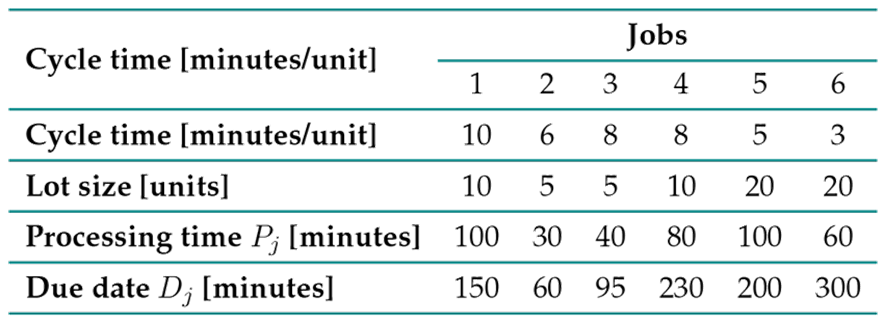 To formulate the MILP problem, the value of the α and β penalties was taken, which depends on the problem to be addressed. If minimizing the work-in-process (WIP) is required after assembly at the workstation, the value of α must be greater than β. On the contrary, if one wishes to minimize job delays to shorten the makespan of the process, then β must be greater than α. To generate the MILP model, the following variables were defined: